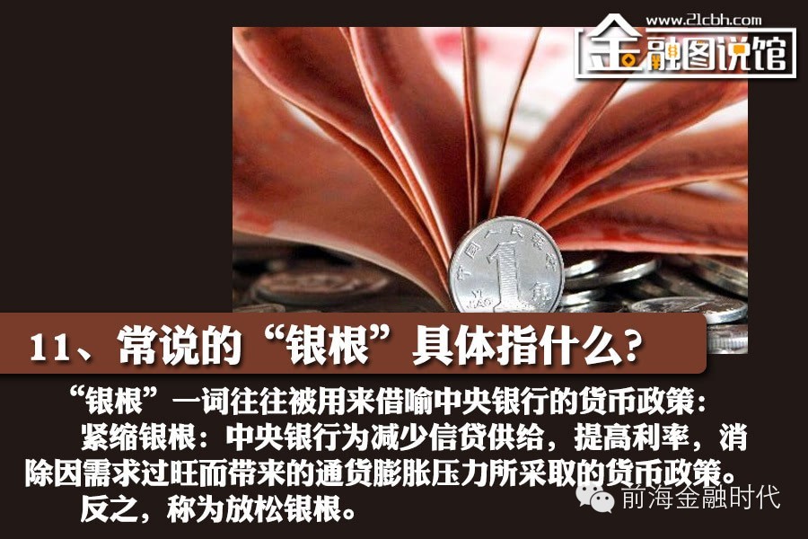 银根一词往往被用来借喻中央银行的货币政策:中央银行为减少信贷供给,提高利率,消除因需求过旺而带来的通货膨胀压力所采取的货币政策,称为紧缩银根。反之,为阻止经济衰退,通过增加信贷供给,降低利率,促使投资增加,带动经济增长而采取的货币政策,称为放松银根。