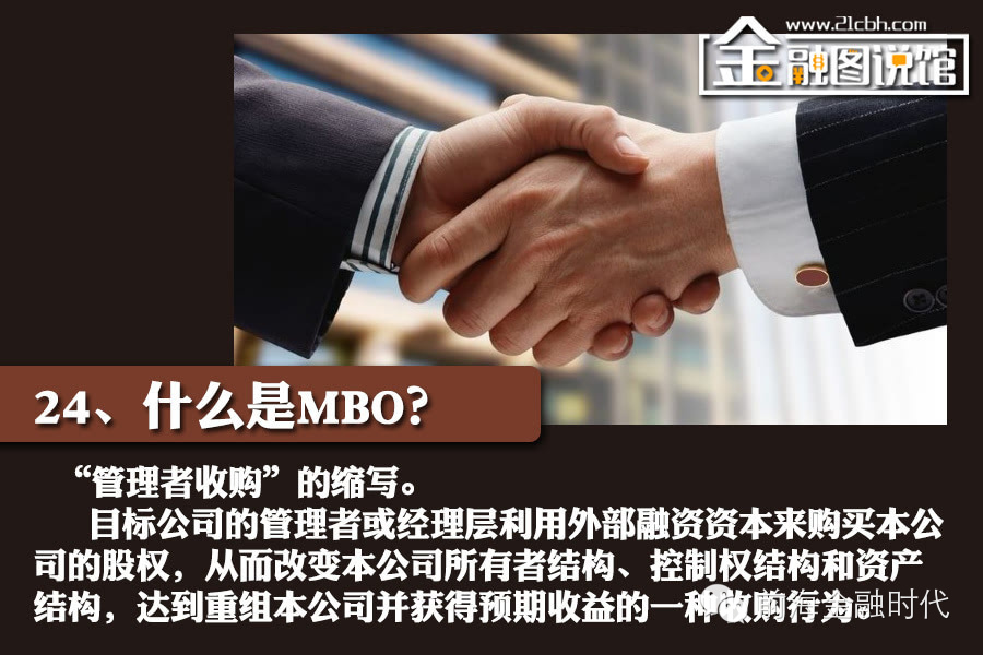 即“管理者收购”的缩写。目标公司的管理者或经理层利用外部融资资本来购买本公司的股权,从而改变本公司所有者结构、控制权结构和资产结构,达到重组本公司并获得预期收益的一种收购行为。完成MBO之后,昔日的管理者就变成今日的股东了。